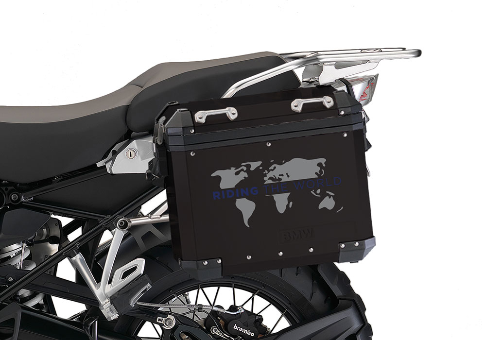 BMW Black Aluminum Side Panniers The Globe Grey & Dark Blue Stickers