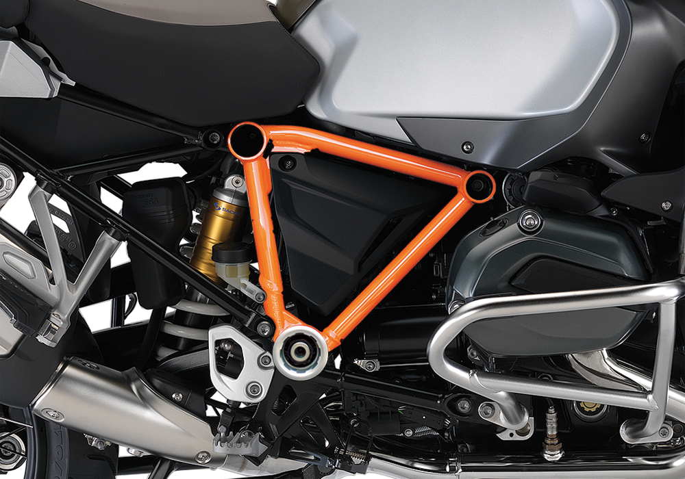 Signature Custom Designs Revolutionary and Innovative Pyramid Frame Styling Kit, changes the color of your BMW R1200GS LC Adventure frame giving a powder coating effect, without affecting the original color by using ready to fit sticker kit.