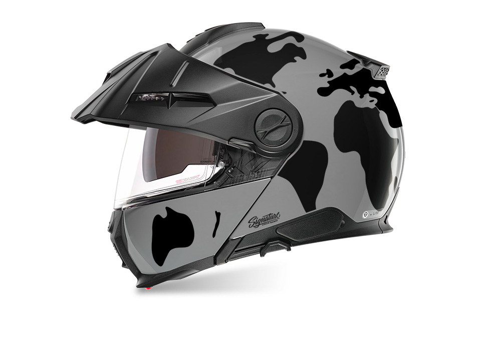 Signature Custom Designs THE GLOBE Series styling kit gives your Schuberth E2 Helmet a unique and adventurous character.