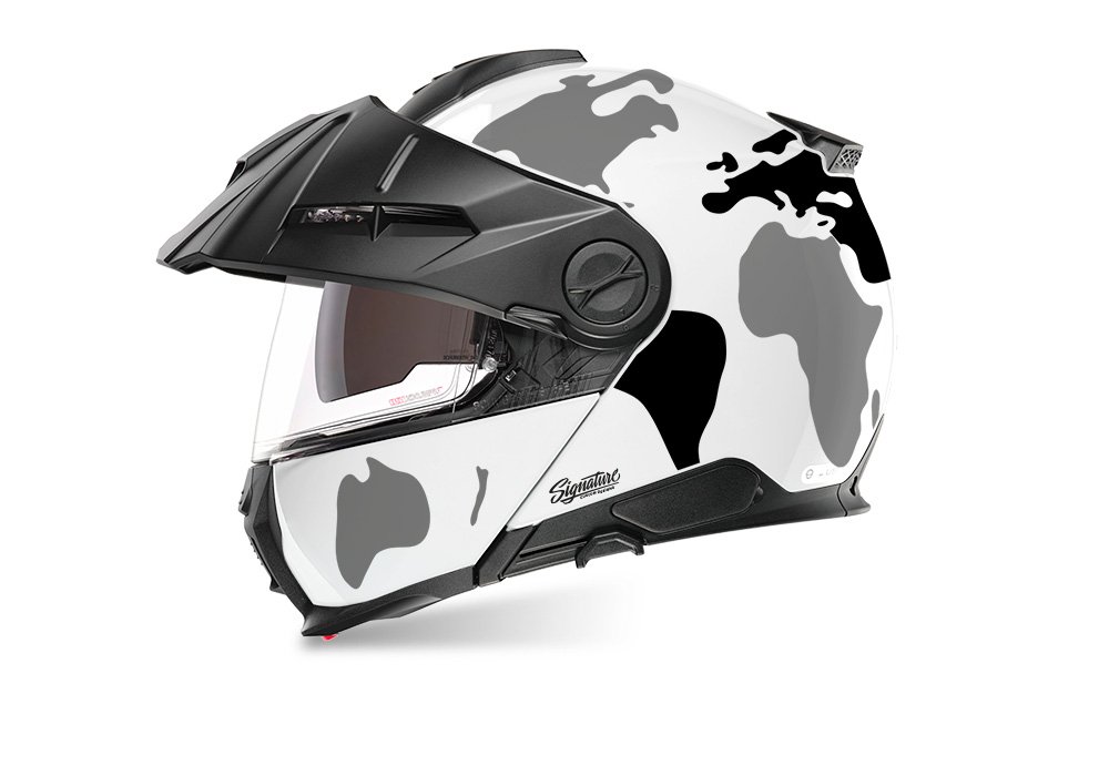 Signature Custom Designs THE GLOBE Series styling kit gives your Schuberth E2 Helmet a unique and adventurous character.