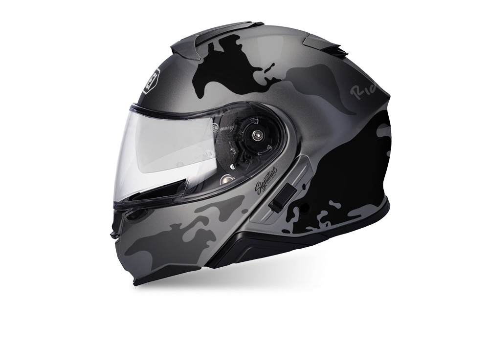 Signature Custom Designs THE GLOBE Series styling kit, gives to your Shoei Neotec II Helmet a unique and adventure character. Gloss finishing stickers on matte helmet creates the perfect contrasting touch!
